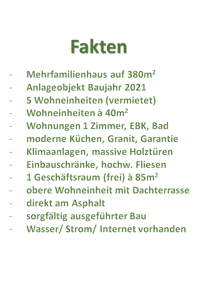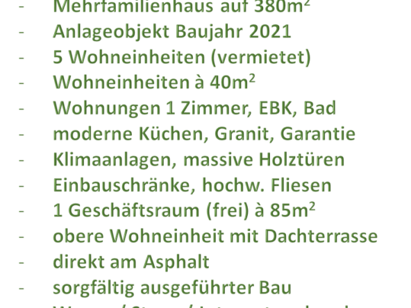 Dieses großartige Anlageobjekt liegt in einer ruhigen Wohngegend der Stadt Campo 9 direkt am Asphalt. Alle 5 Wohneinheiten sind derzeit vermietet und sorgen für beständige Einnahmen. Ideal für passiven Nebenverdienst. Der Geschäftsraum im Erdgeschoss ist geeignet für alle möglichen Kleingewerbe. Das Gebäude ist neu und nach ordentlicher Bauausführung in einem hervorragenden Zustand.